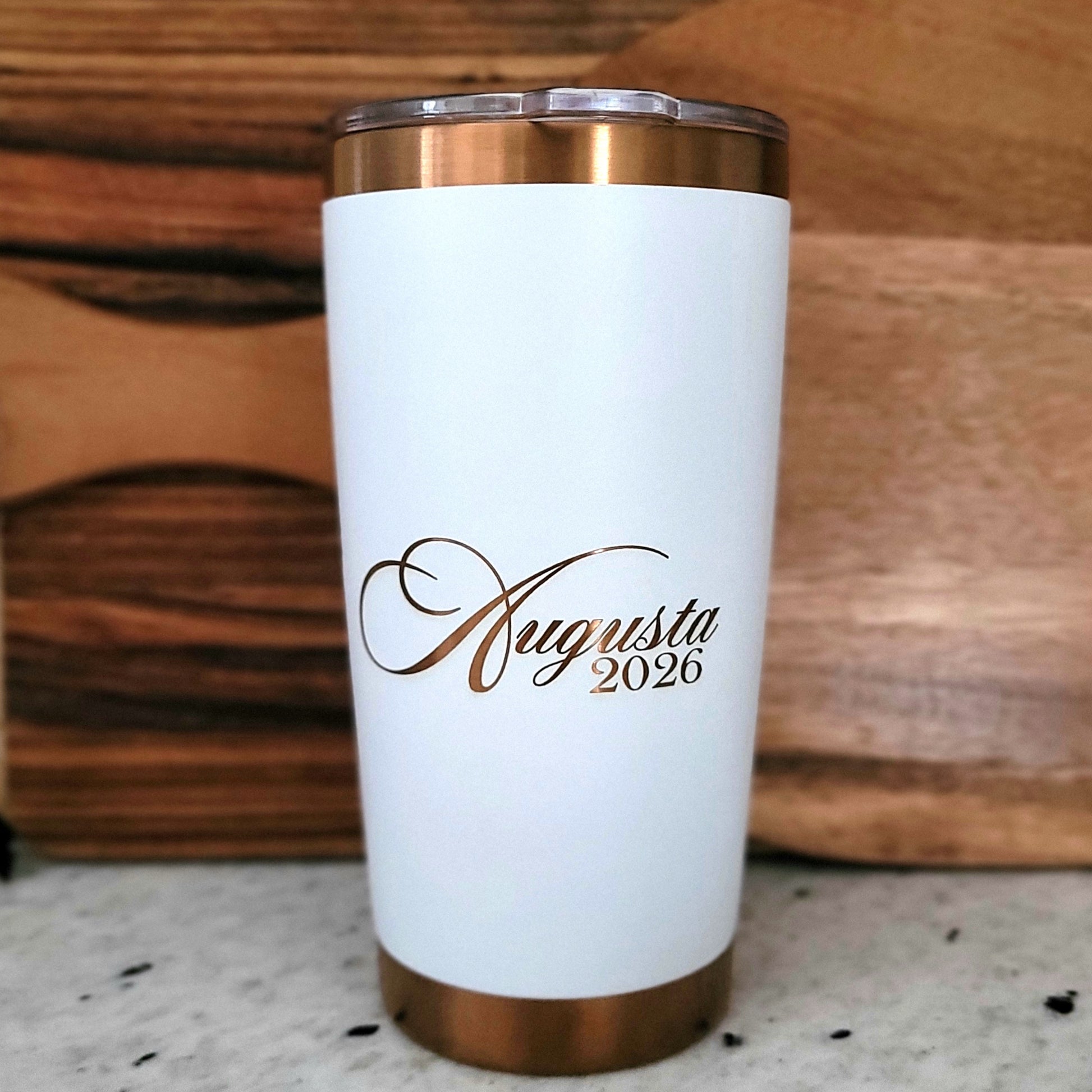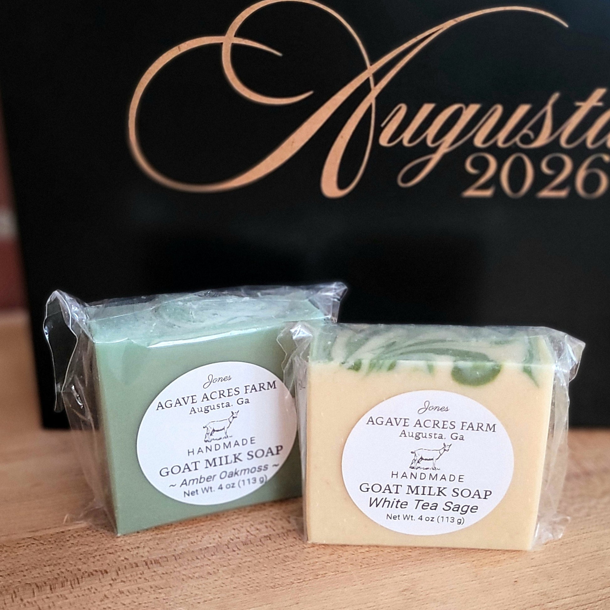At its center, a GA-shaped serving board with a custom "Augusta Azalea" design sets the tone, complemented by a cognac vegan leather coaster set, and a 6x6 catchall tray. A white-and-copper engraved tumbler, two artisan goat milk soaps from Agave Acres Farm in Amber Oakmoss and White Tea Sage, and four Augusta Golf iced cookies complete the collection.