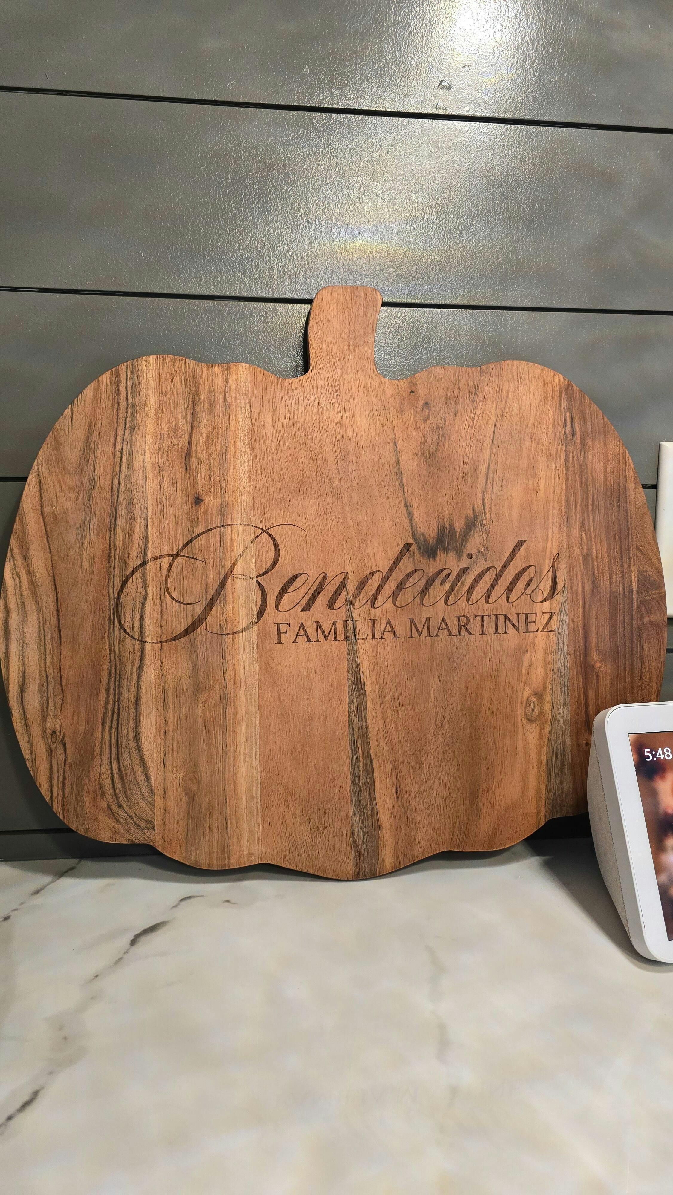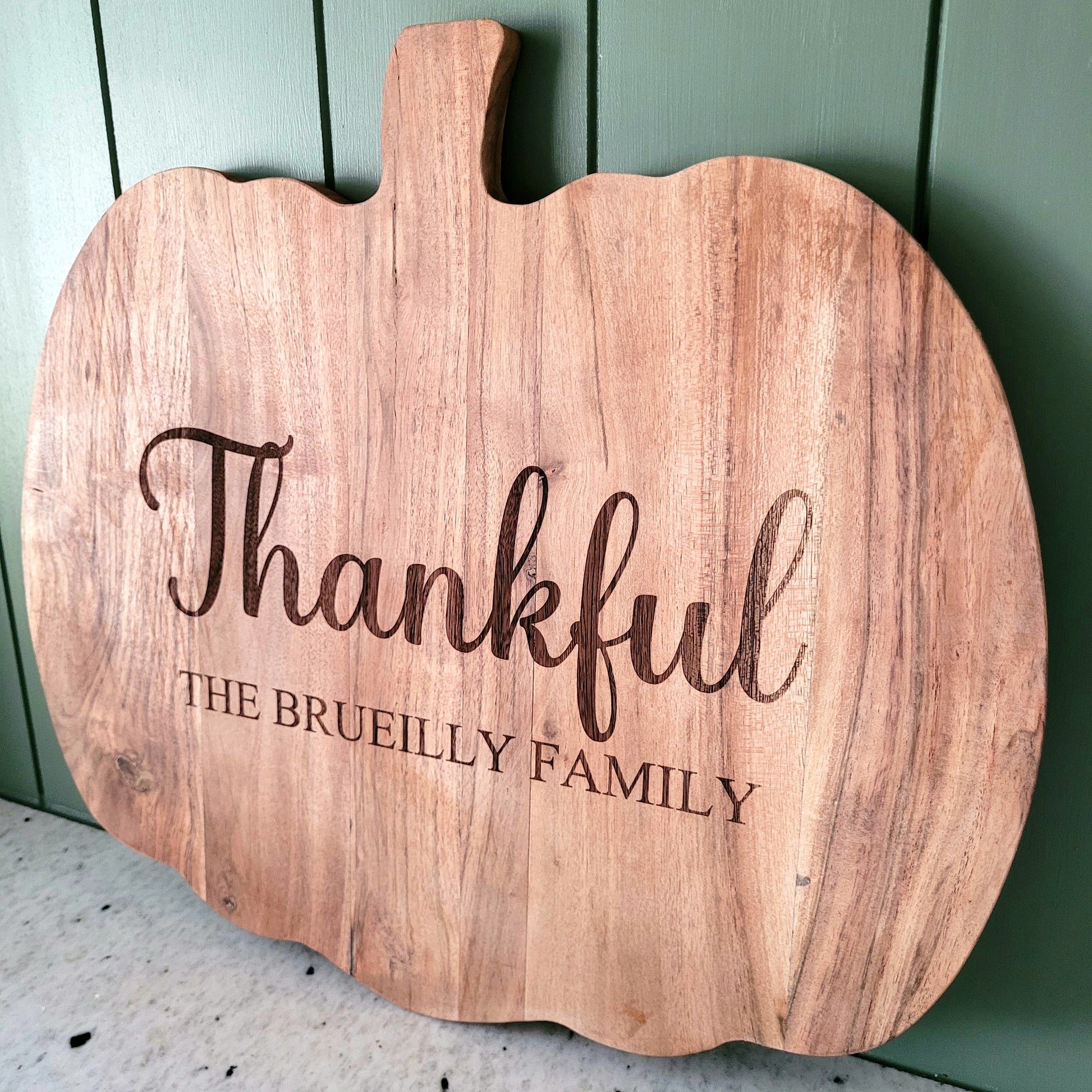 Each board features our exclusive Thankful design, customized with your family name (“The _____ Family” or shortened to "The [family name]" depending on length of name) for a personal touch that makes it truly yours.